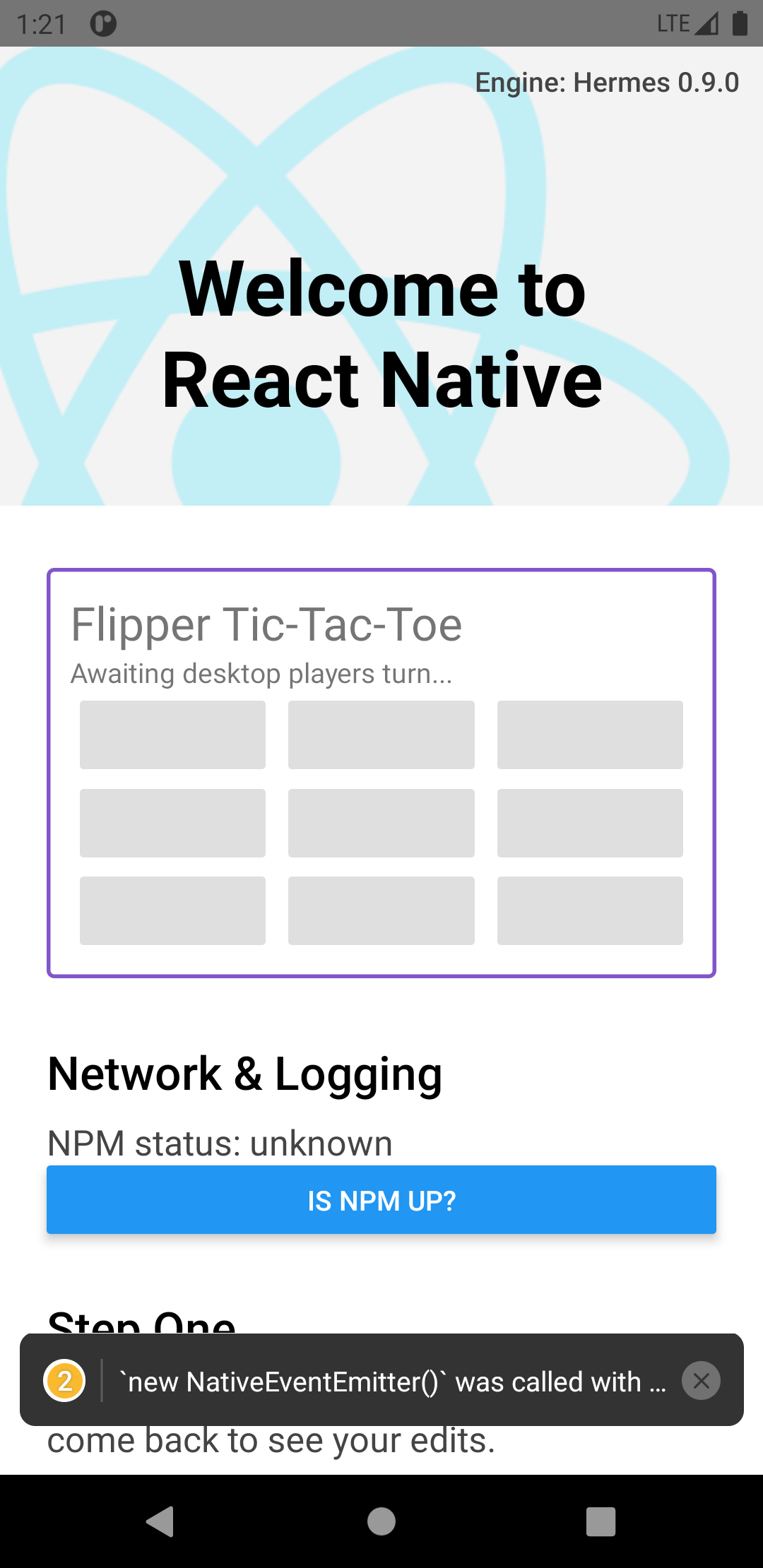 Summary: With React Native v0.65+, `NativeEventEmitter` shows non-null argument warnings. Issue https://github.com/facebook/flipper/issues/2707 ``` `new NativeEventEmitter()` was called with a non-null argument without the required `addListener` method. `new NativeEventEmitter()` was called with a non-null argument without the required `removeListeners` method. ``` ## Changelog https://github.com/facebook/flipper/issues/2707 - Fix NativeEventEmitter warnings for android Pull Request resolved: https://github.com/facebook/flipper/pull/2975 Test Plan: - Add `redux-flipper` plugin to `ReactNativeFlipperExample` project ## Screenshots #### Before  #### After  Reviewed By: passy Differential Revision: D32243694 Pulled By: mweststrate fbshipit-source-id: 21e490a275875268fea982ac1e855ca4bed02bc8 |